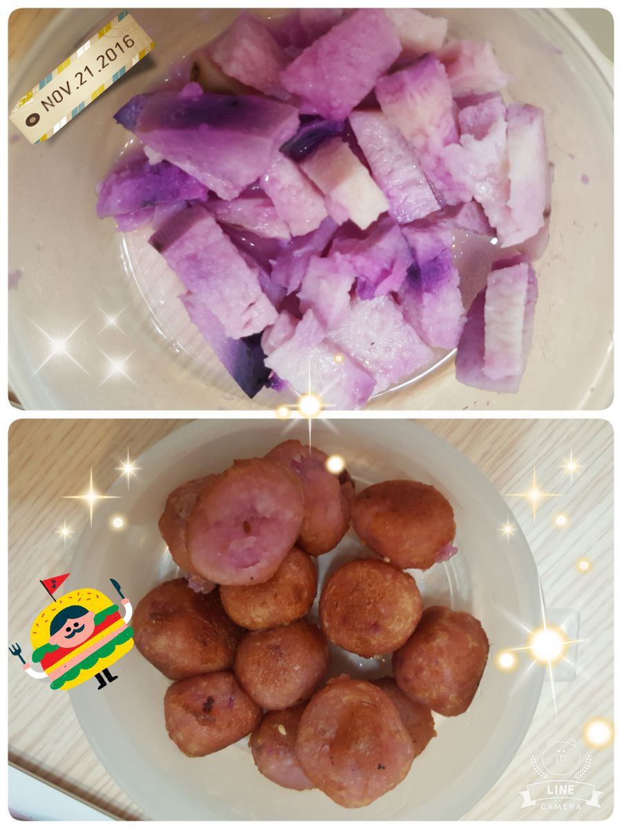 4. 熱油鍋,慢慢放入步驟3的紫山藥球,炸至表面呈金黃色,即可撈起瀝乾油脂。