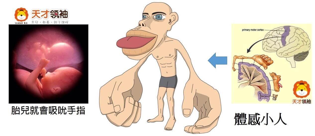 其實,寶寶天生就會吸手指,甚至在子宮裡面就會吸了。寶寶吸手指是有生理和心理需求的,想睡覺、肚子餓、無聊、過度刺激及尋求安全感時,寶寶都會出現吸手指的行為,這是因為手指在大腦感覺皮質區域所佔的比例相當大(如下圖),所以吸吮手指這樣的觸覺刺激,對於感覺敏感的手指和口腔,非常有助於寶寶情緒的安撫,甚至寶寶也藉由這樣的感覺運動,認識自己的肢體,利於之後的發展。