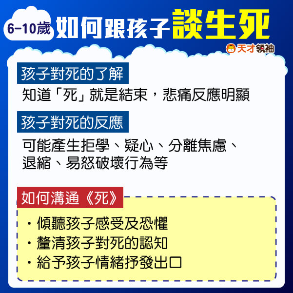 這年紀較具邏輯思考能力,也較能表達自己的想法及感受,他們知道「死亡」就是結束,所以悲痛的反應會更顯著,例如產生拒學、疑心、分離焦慮、退縮、易怒破壞行為等。這時的孩子了解,死亡不是只有發生在別人身上,自己也會死。