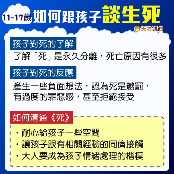 雖然他們了解死亡,但卻未像大人一樣會處理感受,開始會害怕自己死亡,會討論這樣的人生公不公平。由於正值青春期,別太過期待孩子會願意跟你討論,因此你的「耐心」很重要。給孩子一些空間,讓孩子跟有相關經驗的同儕接觸,當孩子詢問死亡相關的資訊,盡量告知不隱瞞,家長自己要成為好模範,讓孩子學習如何面對。