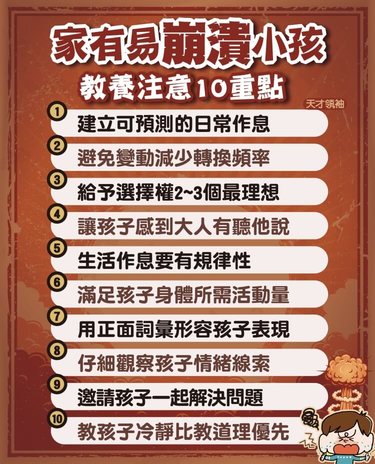 每個人先天的個性氣質不同,易崩潰孩子就是先天氣質上對某些事物特別敏感,反應特別激烈,就像是一輛很靈敏的跑車一樣,油門稍微踩一下就會爆衝,方向盤稍微轉一下,就可能大幅度轉彎,爸媽所需要做的,就是讓孩子了解自己這台跑車的性能有多強,學習駕馭,未來才能平穩的駕駛在社會的道路上。因此在教養上,爸媽要注意10重點: