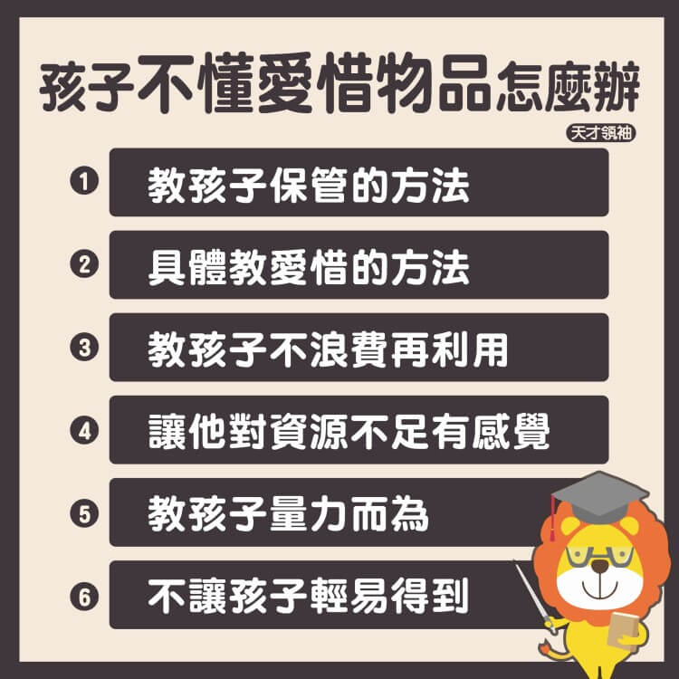其實,孩子不是不愛惜,而是他們不知道什麼叫「愛惜」?該怎麼「愛惜」,更明確的說,他或許認為他有愛惜,但爸媽認為沒有,彼此間的標準不同,因此希望教出會珍惜、會愛惜物品的孩子,最重要的就是要做到下面六方向: