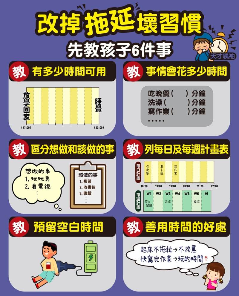 當然還有幾多種可能會造成拖延,例如完美主義的孩子,可能會因為還沒想到最完美的方法而遲遲不動工;要做的事太多,不會計劃就會拖;沒有時間觀念,常覺得時間還很多,也會一直拖……。