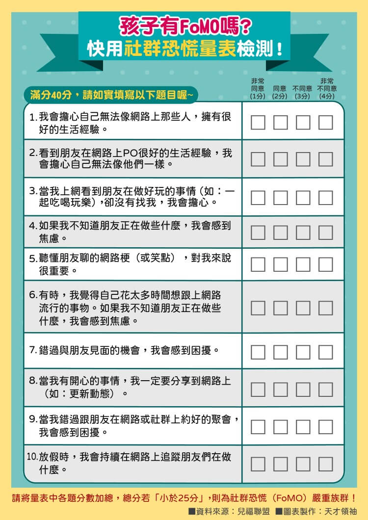 ▼擔心孩子有FoMO?快用社群恐慌量表檢測,總分若「小於25分」為社群恐慌嚴重族群!
