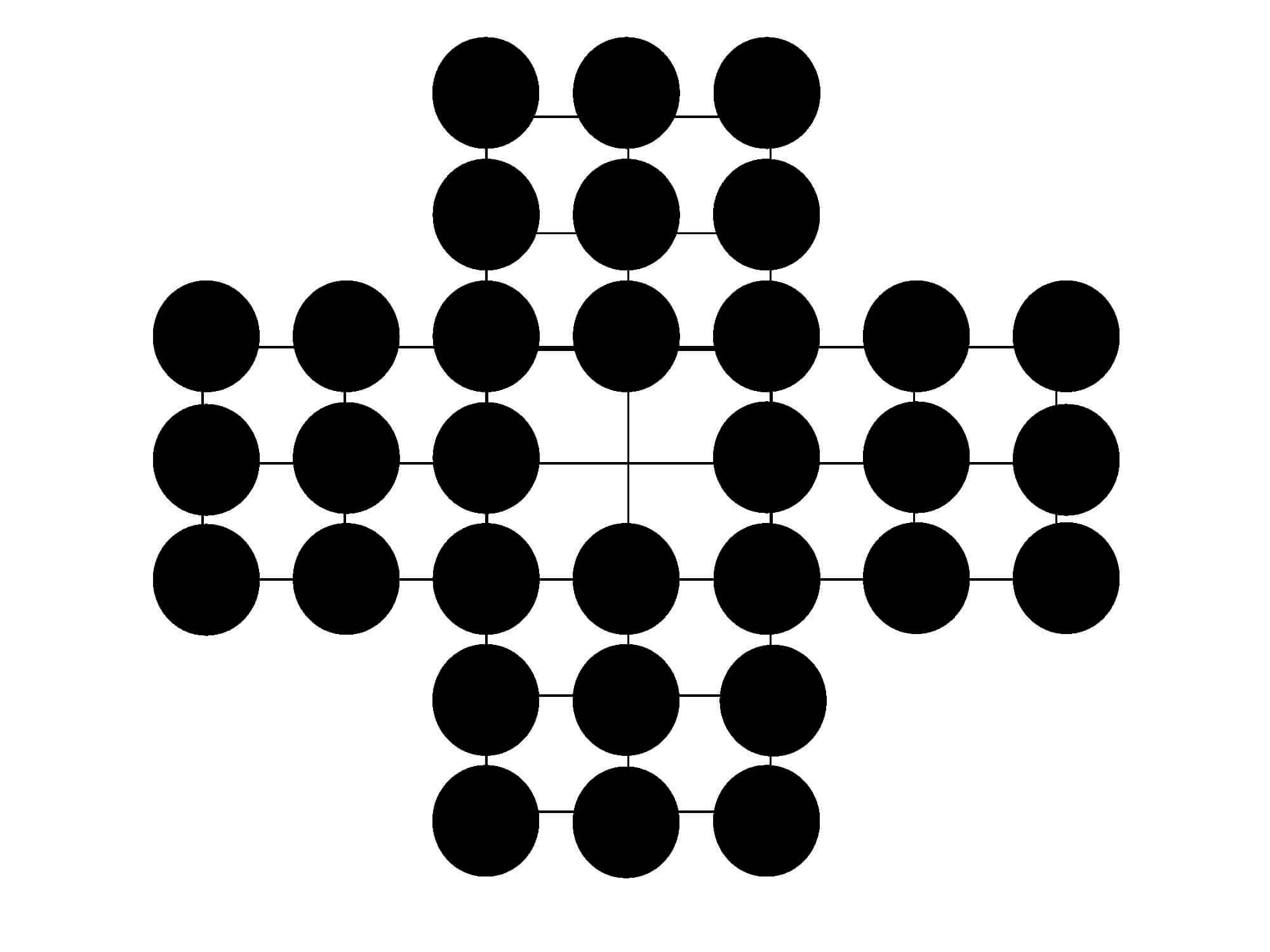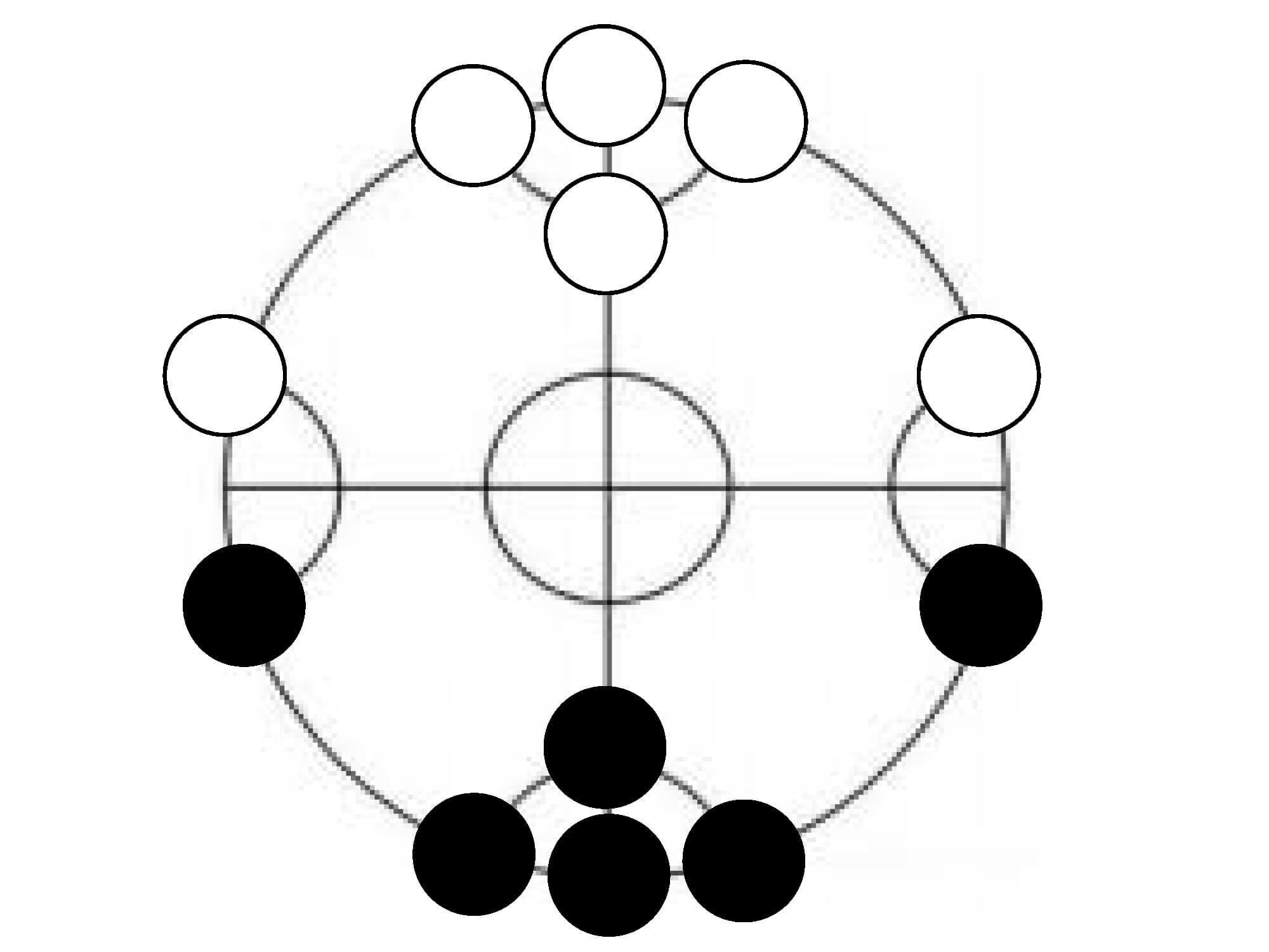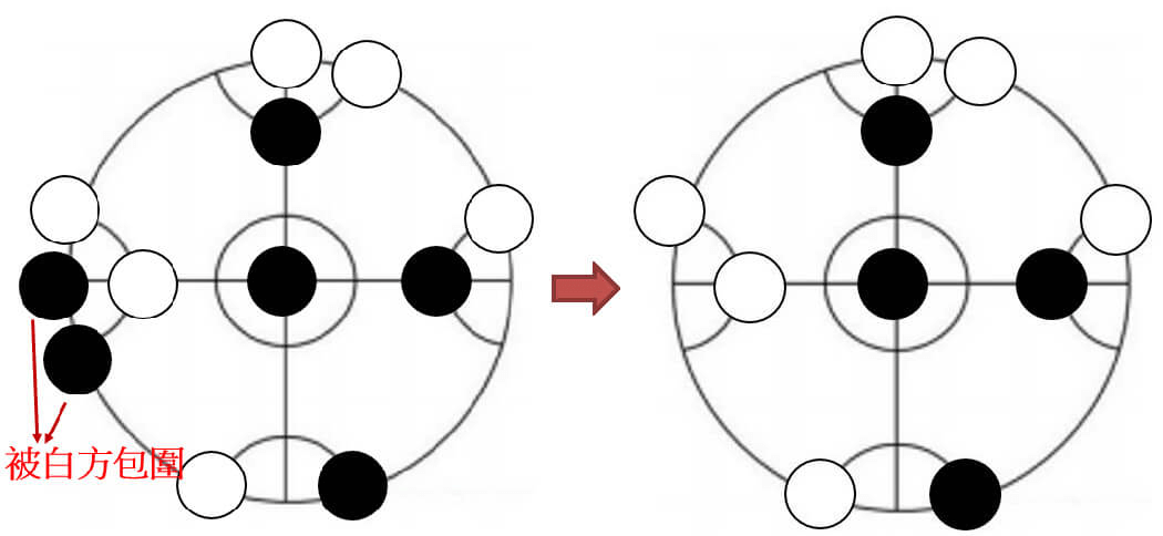 3.每次只能沿線走一步至交叉點,當一方將對方的棋子包圍,使對方棋子不能移動,就可以將這些被包圍的棋子吃掉。