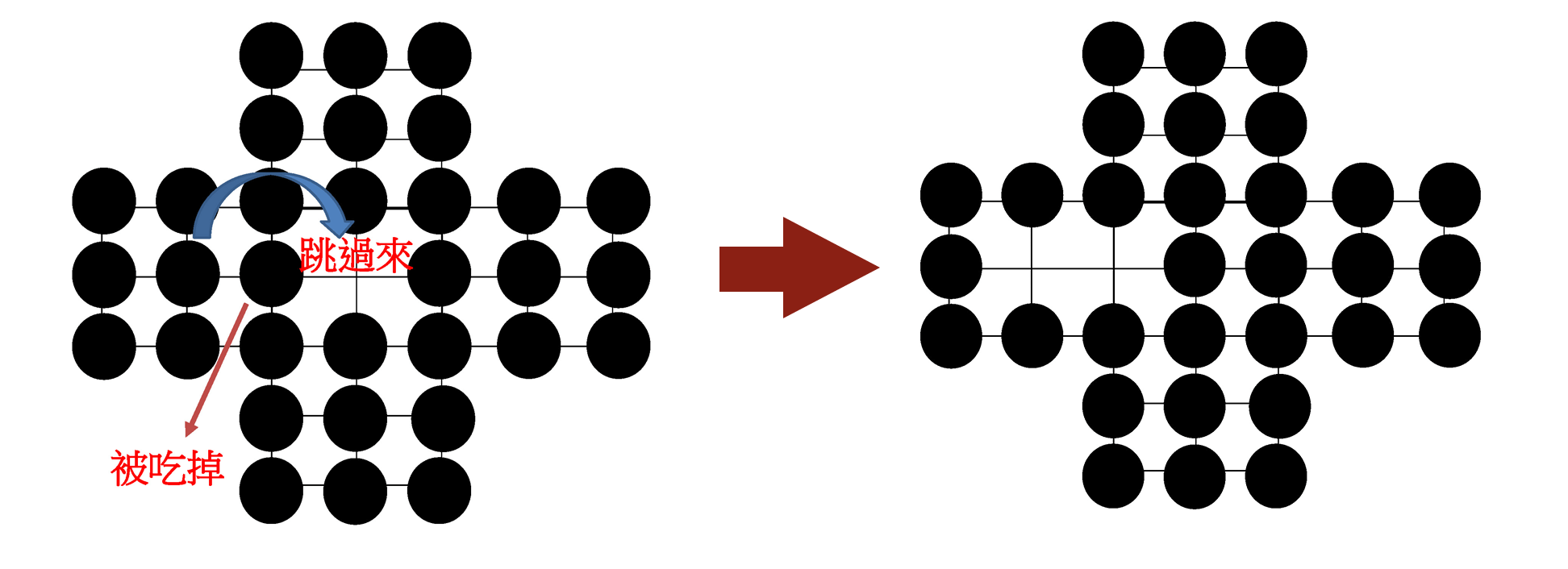 2.棋子只能用跳的方式來移動,跳過一個棋子到前一個空格上,就可以將跳過的那顆棋子吃掉。