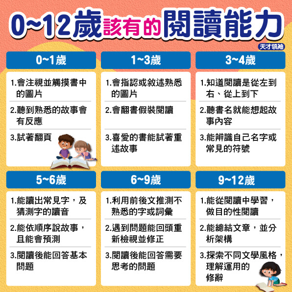 閱讀行為是隨著年齡增長而產生質量變化的,出生到6歲稱為「前閱讀期」,這個時期是以認識「書本」、認識「文章」、認識「閱讀」是怎麼一回事為主,所以在此時期最重要的就是讓孩子對書本有好感。小學後識字量大增,在三年級以前都是在學習閱讀(learning to read),而到了小學中高年級,孩子就會進入閱讀中學習 (reading to learn)階段。