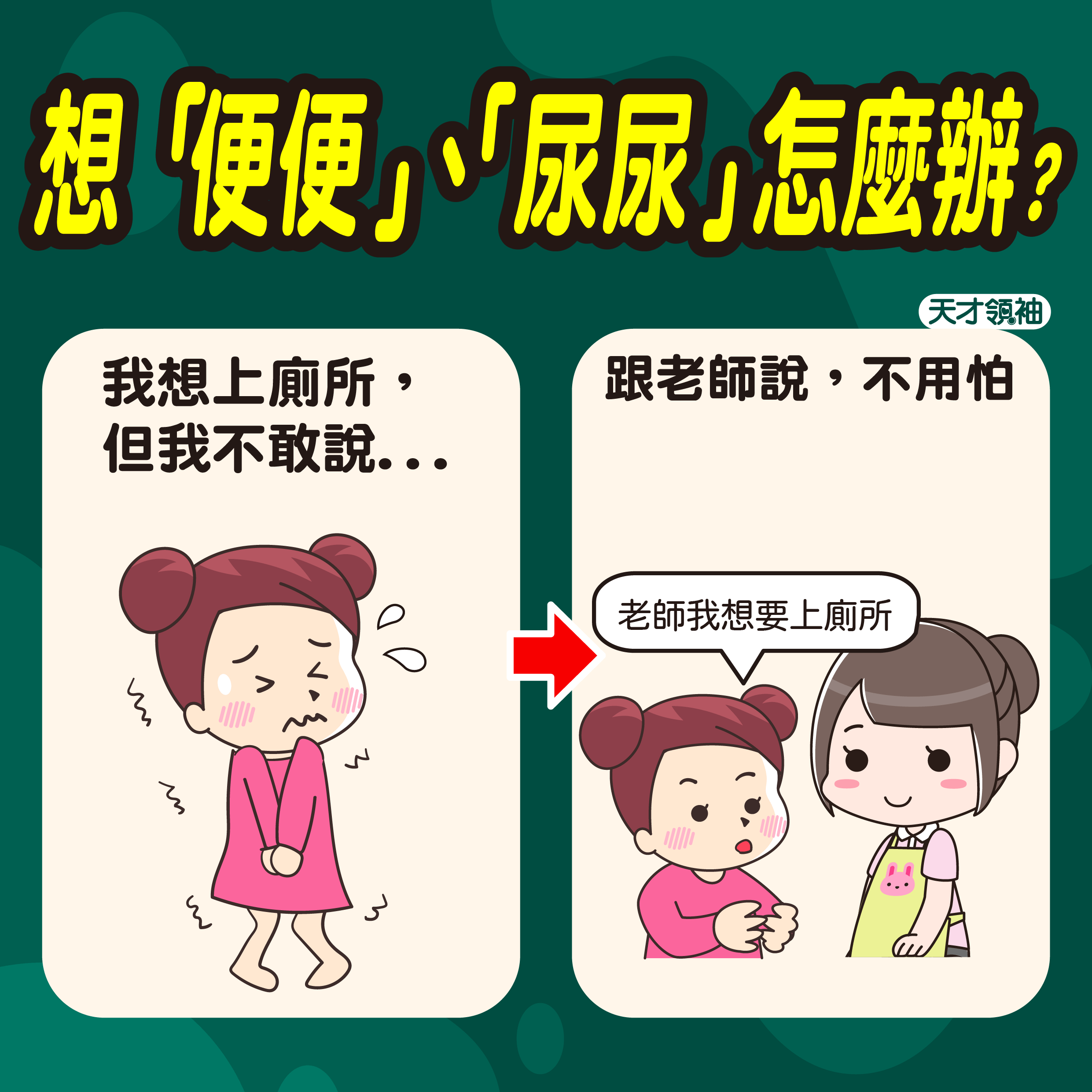 - ◆提醒孩子,告訴老師,老師都會讓你去。