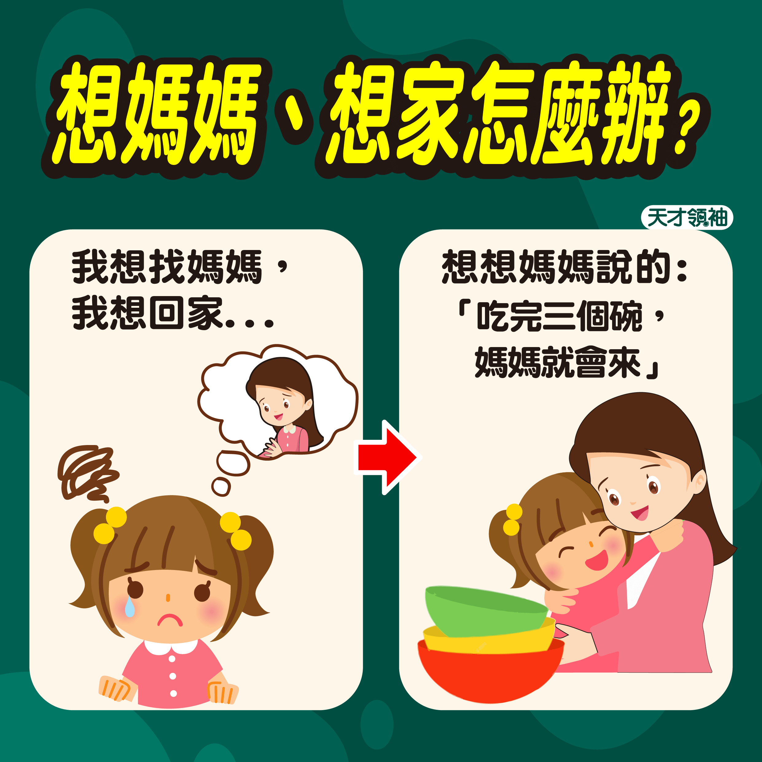 - ◆提醒媽媽說的話:「吃完三個碗,媽媽就會來。」