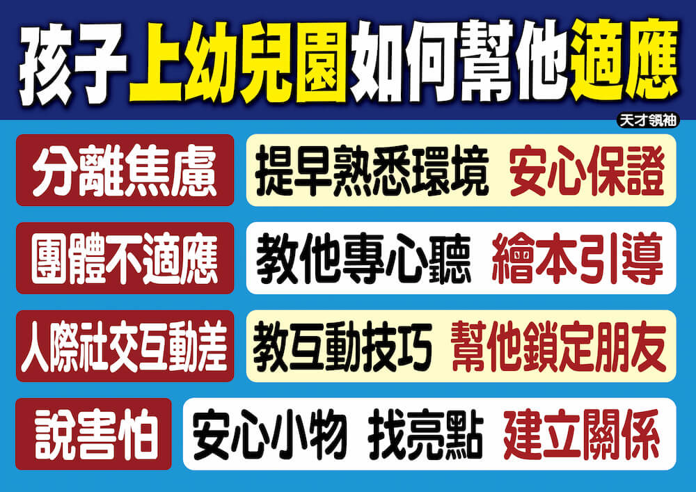 另外,也能跟小孩聊學校的事物,幫他找亮點,讓孩子發現到學校中好玩的地方。同時協助他們與老師和同學建立關係,也能減緩孩子逃避學校的情緒,所以爸媽千萬不要把小孩送到幼兒園就覺得沒事了,只有多與老師配合並和孩子多聊,才能更好的幫助她們融入學校生活。
