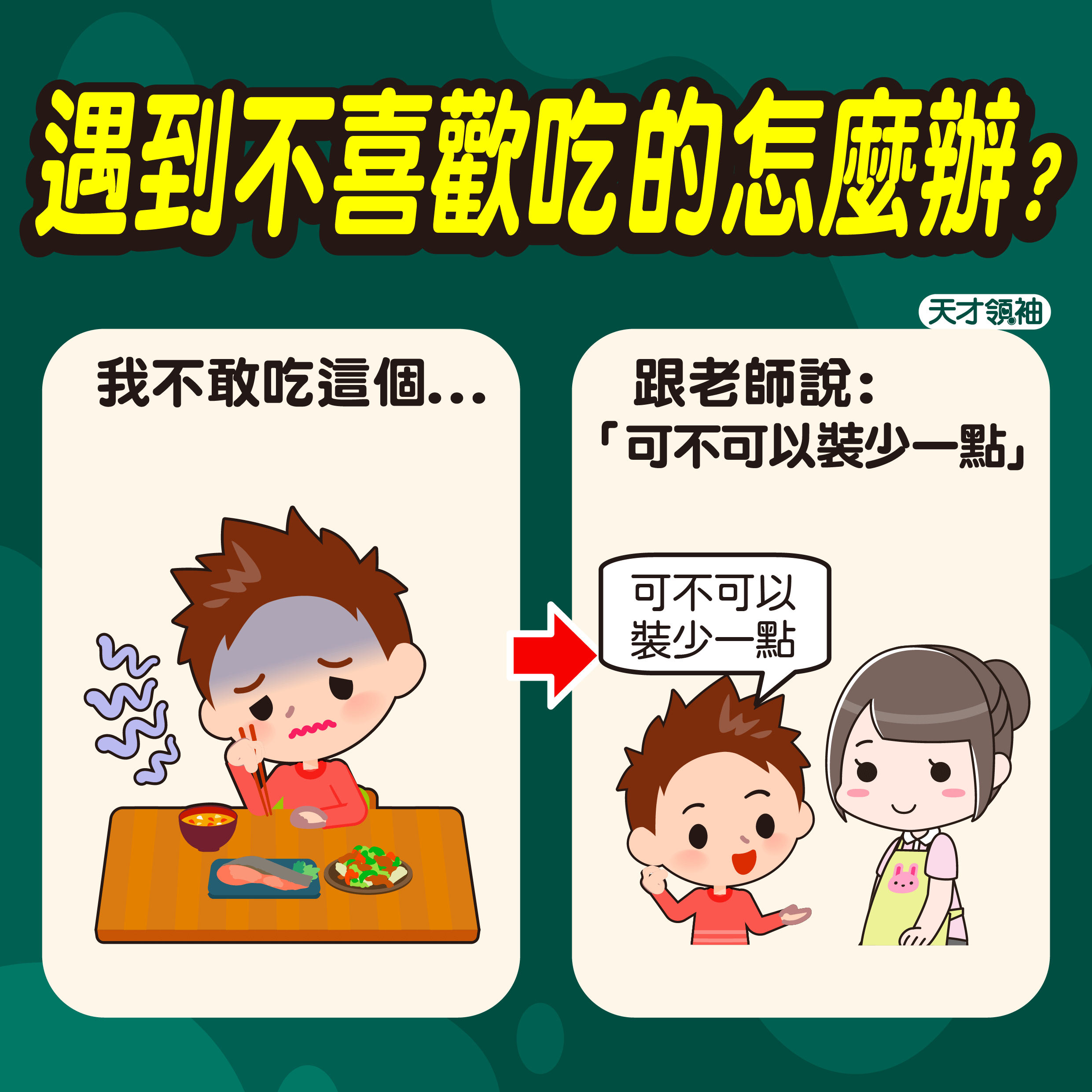 - ◆事先跟老師溝通孩子的挑食問題,當孩子主動表達時,初期請老師不給壓力。