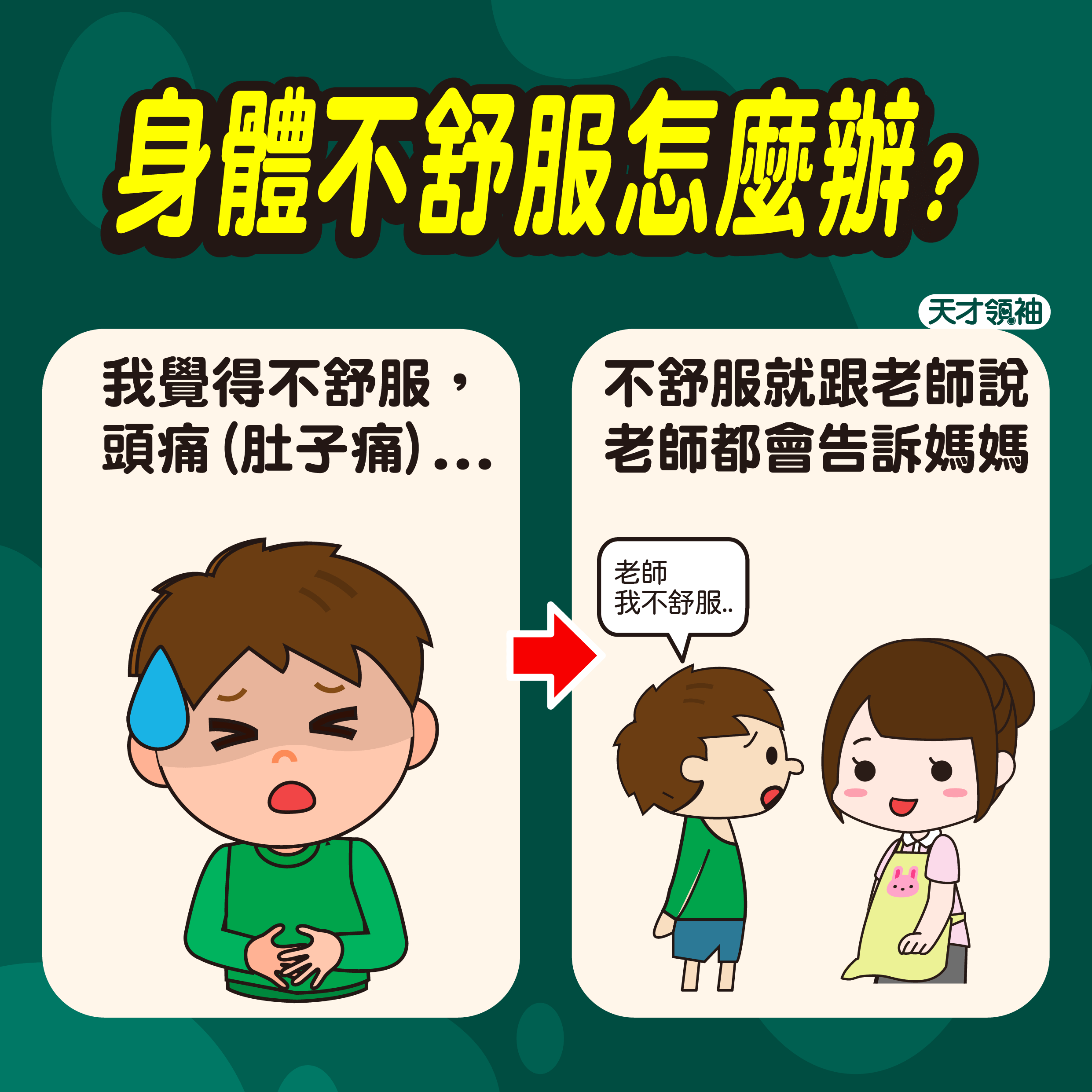 - ◆教導孩子清楚表達自己不舒服的部位。