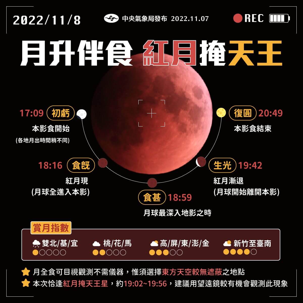 根據中央氣象局指出,月球將在17:02升起,17:09為初虧,月偏食開始;18:16為「食既」,出現紅月;18:59進入「食甚」,月球最深入地球陰影之時;19:42為「生光」,紅月漸退,月球開始離開地球本影;20:49「復圓」,偏食結束,全程歷時3小時40分。