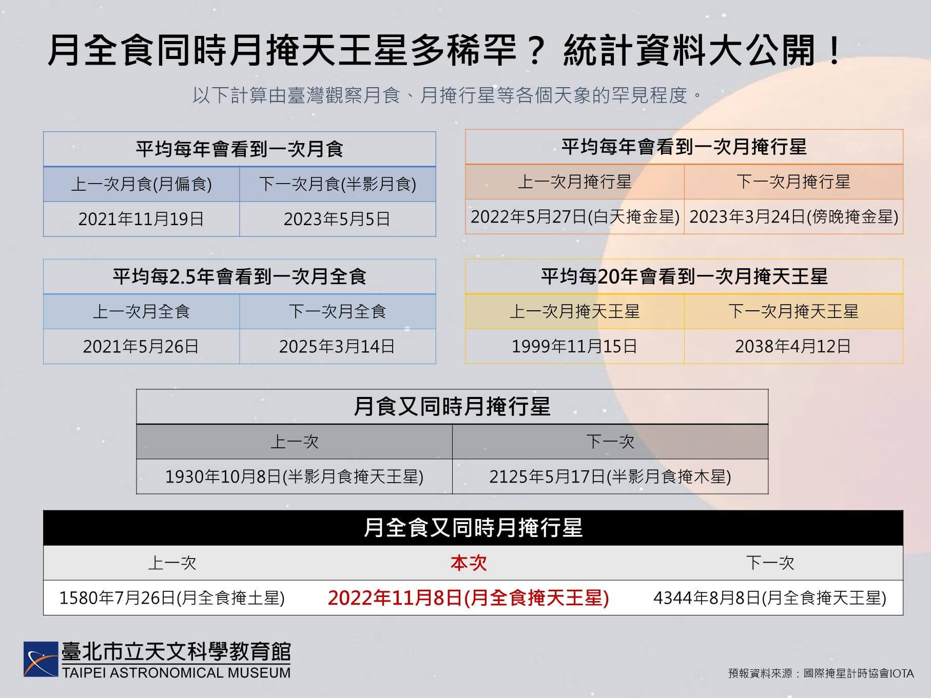 雖然月全食與月掩行星事件各自常發生,但雙天象同時共演就很少見。根據台北市立天文館指出,平均每2.5年會看到一次月全食,每20年會看到一次月掩天王星,但是要「月全食又同時掩天王星」相當不容易,上一次是發生在西元1580年,而下一次發生在4344年,讓不少天文迷都相當關注這次天文奇景。