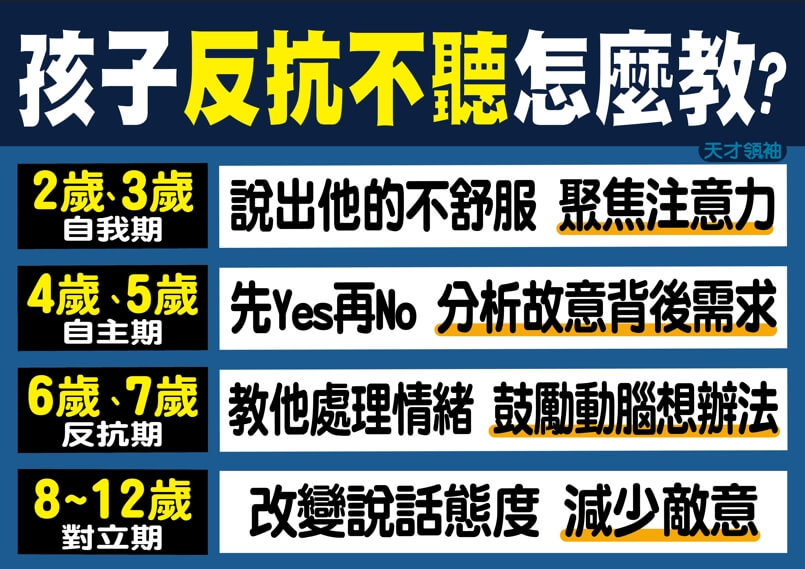 2歲開始,孩子堅持度很高,不喜歡被控制、凡是想要自己來,他們想要證明自己的能力,所以就變得越說越故意,變得很愛說「不要」拒絕大人,這其實是一種心智成長的歷程~面對2、3歲的孩子反抗不聽,大人可以先認同他們的感受,說出他的不舒服,像是「我知道你不要」、「我知道你沒有想要先收玩具,但是…」,同理他的不舒服,他們的情緒才會平復下來。