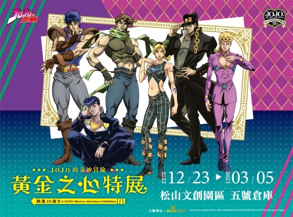 熱血、奇幻作品《JOJO 的奇妙冒險》為紀念動畫推出十周年,本次特展集結2012年至2022年這十年間播出,自《幻影血脈》到《石之海》,總共五季動畫作品的內容進行展出。除介紹動畫各部之重要角色外,展區內將重現眾多經典場景,得以親身感受作品的獨特魅力,更有首次在台曝光的動畫複製原稿展出!