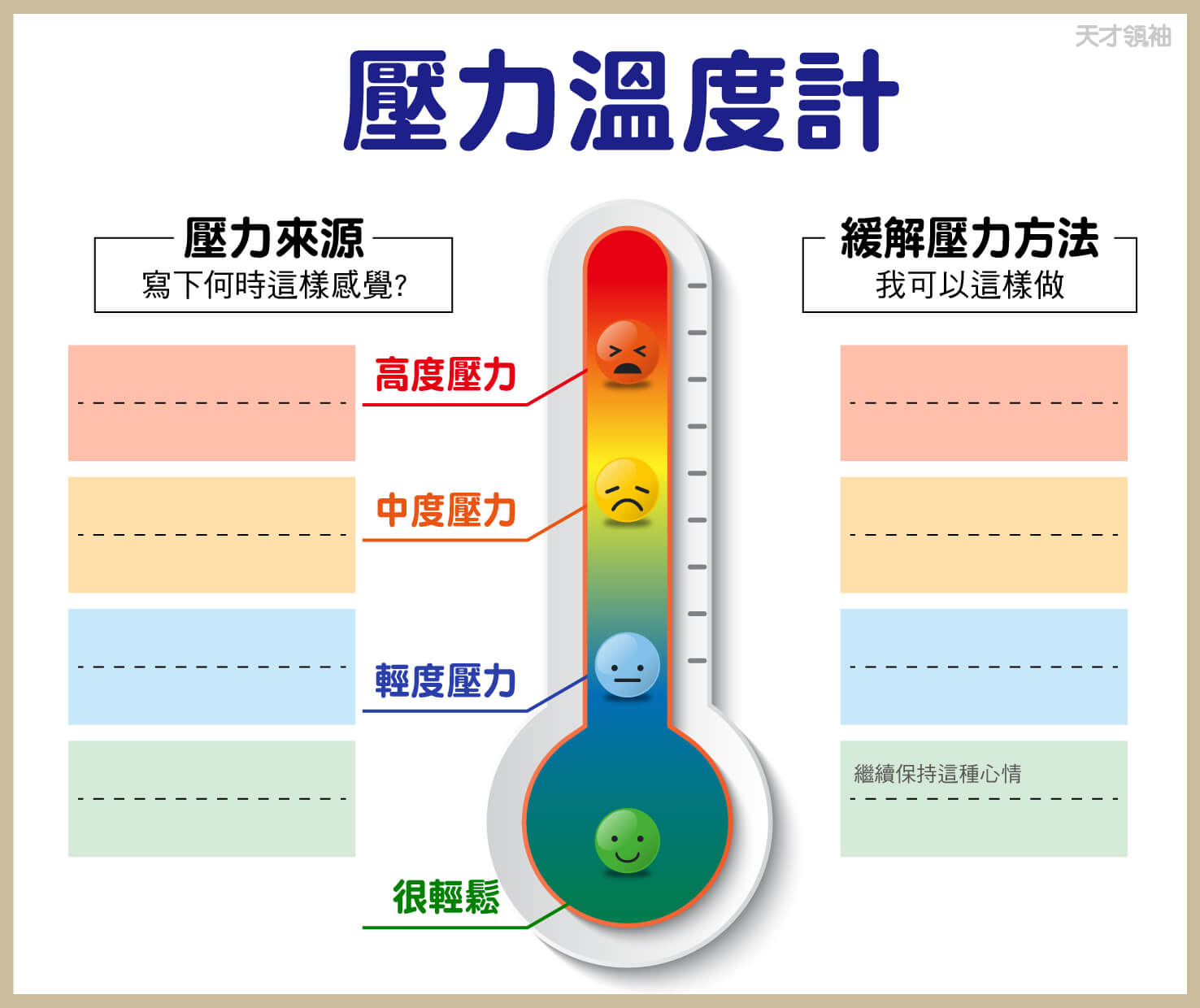 當壓力產生時,一定會有生理變化,例如心跳加快、肌肉緊繃、呼吸加快,甚至感到頭痛肚子痛等,基本上4歲以上的孩子,就可以教導孩子有壓力是什麼樣的感覺,而更小的孩子,則是需要大人敏銳的觀察力,覺察孩子是否在於一個有壓力的狀態。知道”有壓力”,接下來就是要知道壓力從何而來,可以透過”壓力溫度計”,記錄自己或孩子什麼時候有這樣強度的壓力,這有助於決定接下來的應變策略。