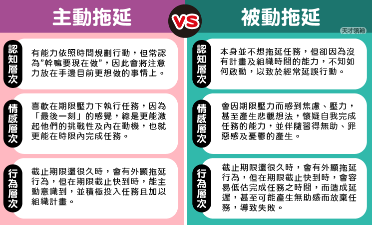 因此想要改善拖延問題,首先該做的不是時間規劃、組織計劃能力的培養,而是學習心態的調整。因為並不是每個會拖延的人,都是因為時間規劃與計劃能力不足。依照拖延的內在動機,大概可以分為兩類型:主動拖延與被動拖延。