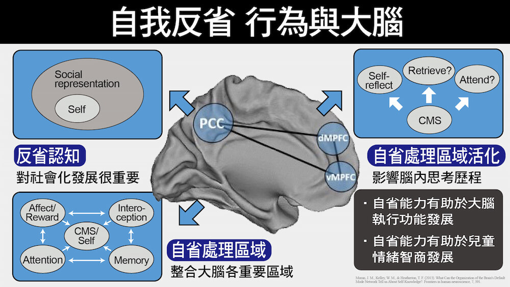 研究發現,當人們在進行自我反思(包括反思自我的人格特質或思考自我概念與自尊)的時候,大腦裡的預設網路模式(default mode network, DMN)會活化,而其中的內側前額葉(medial prefrontal cortex, MPFC)和後扣帶迴(posterior cingulate cortex, PCC),這兩個區域又被稱為皮層中線結構(cortical midline structures, CMS),被認為和自我反省能力更為相關,它們能整合大腦內外部各重要區域的信息。
