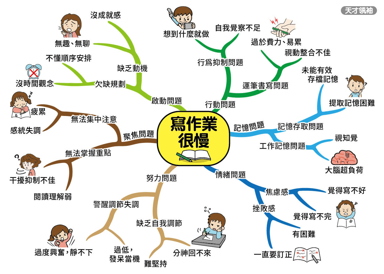 因此,在反應孩子寫作業慢時,需要了解孩子的大腦,究竟是在執行功能的哪個(些)環節出了問題,加以訓練或調整,才能有效改善。