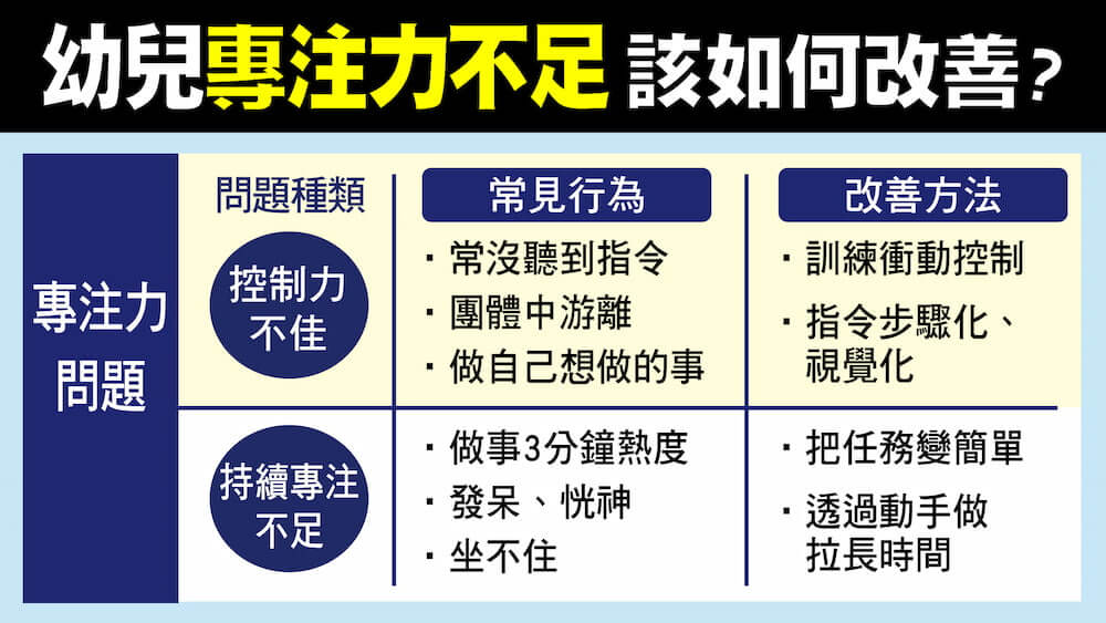 因此,我們將幼兒常見的專注力問題,分為兩大類型: