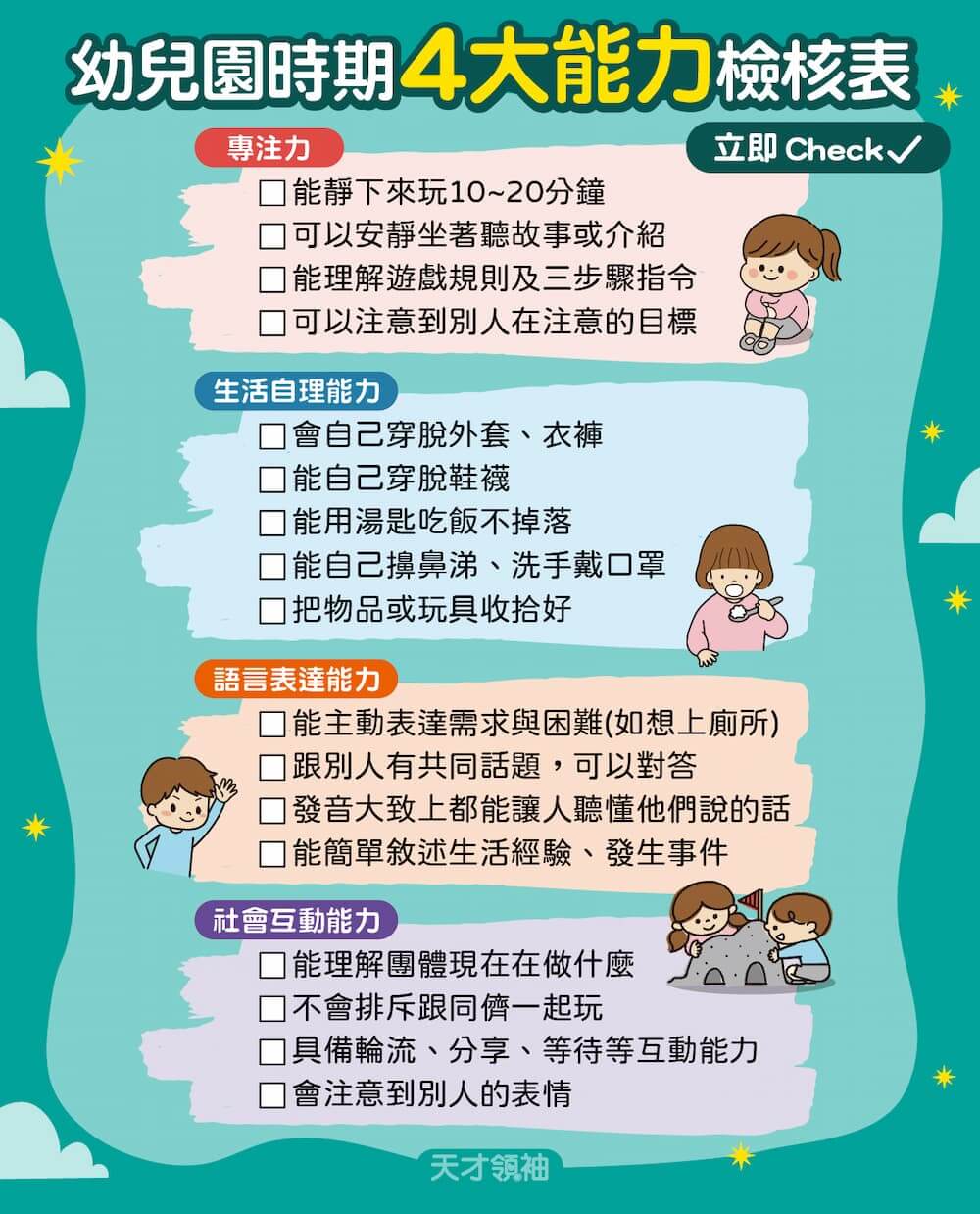 透過天才領袖專業設計的「幼兒園時期4大能力檢核表」,幫孩子看看,還有哪部分的能力需要加強訓練吧!