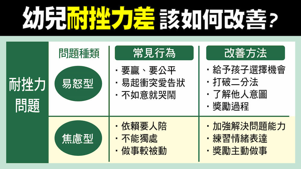 改善方法可以多加強他們的解決問題能力,像是透過一些遊戲書、桌遊,讓孩子練習慢慢去面對挫折。當孩子平時碰到困難時,也可以透過問題反問孩子,「遇到什麼問題」、「哪裡可能會有答案」、「可以先從哪裡開始?」…。所以要帶著孩子預想,一開始可以提供孩子各種可能狀況,一起找出解決方法,慢慢地可以引導孩子自己預想,當孩子越來越熟練,莫名的焦慮也能減少。