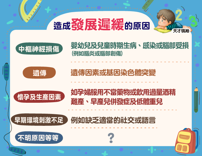 造成發展遲緩的因素很多,先天基因、後天環境都有可能,這些原因包括: