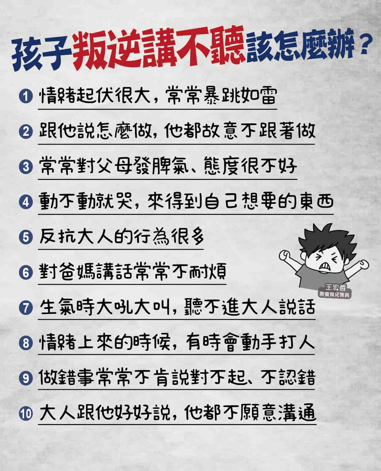 這個年齡的孩子有很多症頭,第一個愛頂嘴,常常跟爸爸媽媽講說你自己還不是一樣,第二個要牽孩子手時、要抱他時,孩子會覺得好噁心,第三個明明是孩子自己沒注意聽,等到做錯後去怪父母,第四個喜歡搬老師出來壓父母。