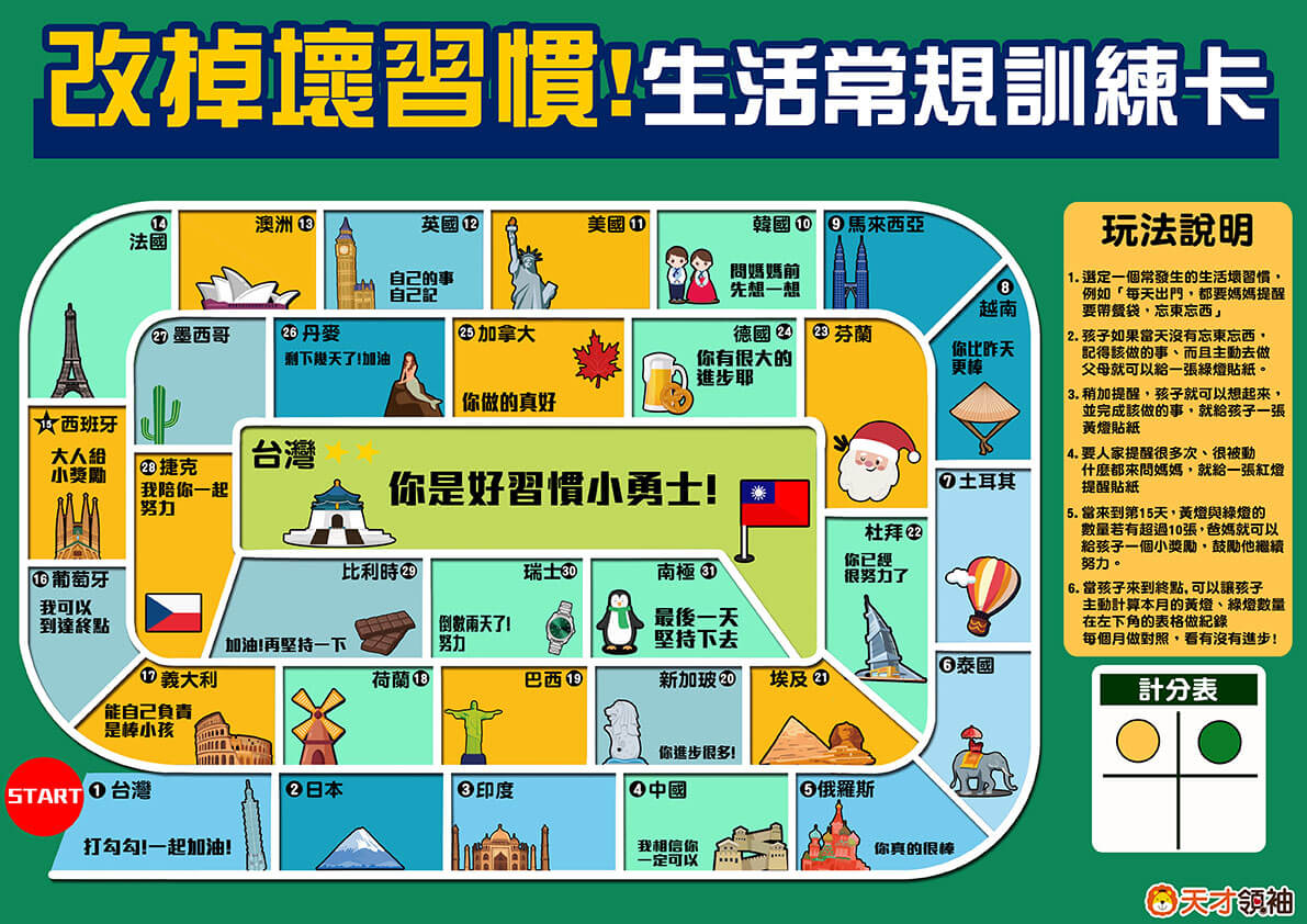 6、當孩子來到終點,可以讓孩子主動計算本月的黃燈、綠燈數量在左下角的表格做紀錄 每個月做對照,看有沒有進步!