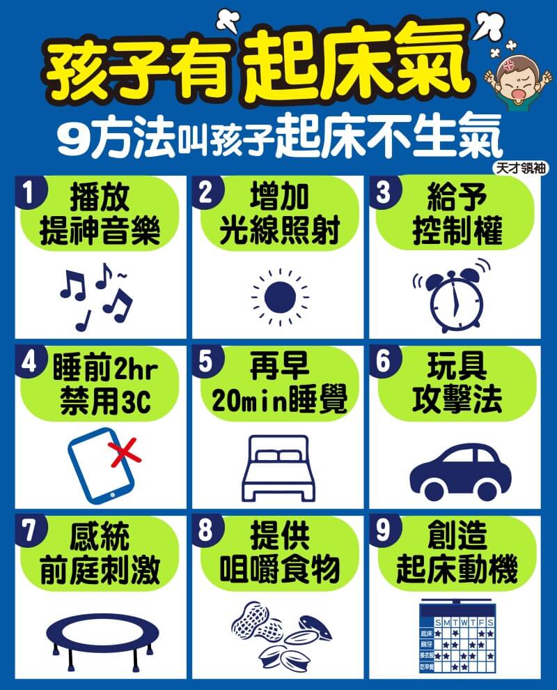 9. 給予孩子一些控制權:一早就是被催促、命令、強迫,當然會有情緒,會賴床的孩子,就該把賴床的時間算進去,讓孩子有些自主控制權,例如在合理的範圍內,讓孩子決定他還要再賴床起分鐘,早餐也能讓孩子決定要喝優酪乳或牛奶、水果穀片或玉米片…等,而前一天就先把該收拾的東西都收拾好,衣服先拿到床邊,並和孩子討論好早上起床後的步驟,減少早上還要一直催促孩子下一步要做什麼,這都能減少孩子起床氣的產生。