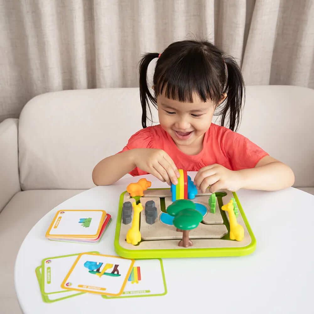 ►訓練遊戲:玩「彩虹動物公園」時,透過動物與公園情境的照片設計的題卡,提供前視圖的經驗,幼兒必須觀察動物與公園的位置,理解前、後、左、右不同方位,才能順利擺放出與題卡相同的場景,由平面逐漸進展至立體,發展出判斷空間關係的能力。