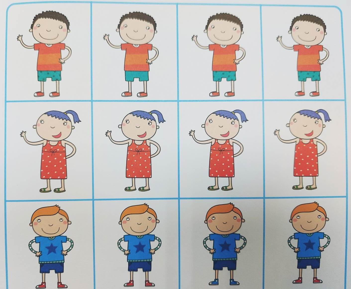 ►遊戲訓練:視覺區辨能力可以透過「找不同」的遊戲來訓練,下圖每一列都有一個不一樣的人物,孩子能找出來嗎?