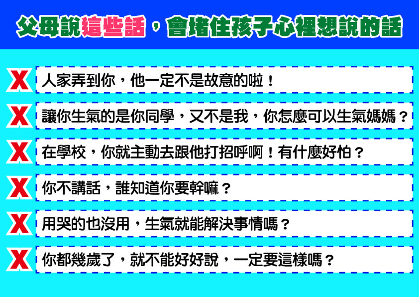 以上這些父母常說的話,大家都很容易説出口,但這不是在引導孩子的情緒,而是在堵住孩子心裡的話。如果父母不改變,孩子遇到挫折或情緖失控時,怎麼會想跟爸媽説呢?所以,情緒教育,大人比孩子更要知道