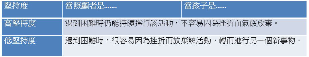 意指遇到困難挫折時,能仍持續此活動的時間長短。