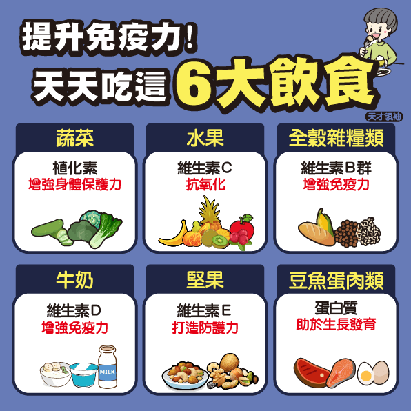 根據衛生福利部的健康飲食建議,應多量且均衡的攝取這6大類食物,最好再搭配適當的運動,可提升免疫力,讓身體更健康!