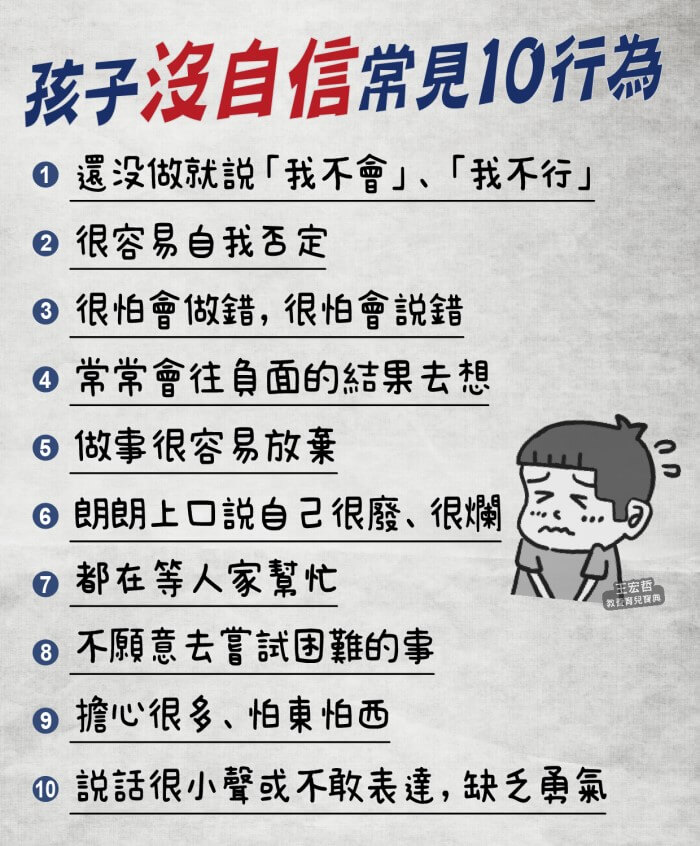 很多孩子常常說我不會、我沒辦法,其實他們不是不會,而是沒自信!自信心對一個孩子的成長很重要,只是現在缺乏自信的孩子很多,常見的狀況有幾種: