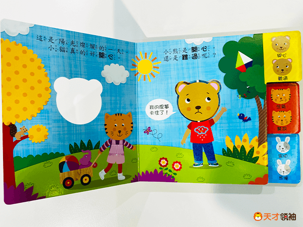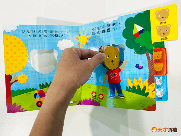 搭配可以旋轉的表情面板,想想看碰到這樣的情況,會是什麼情緒呢?幫小熊把表情轉到和情境相符合的那一面吧!