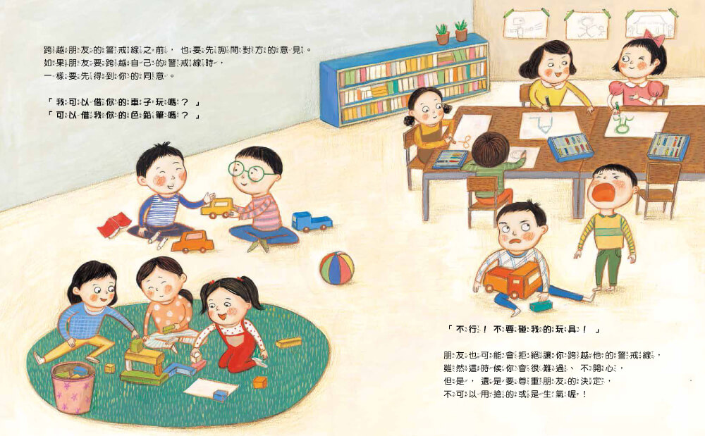 地圖上國家和國家之間有國境線、車道和人行道之間有標線,物品和物品之間以及人與人之間也都有無形的界線,循序漸建立孩子「身體自主權」認知。