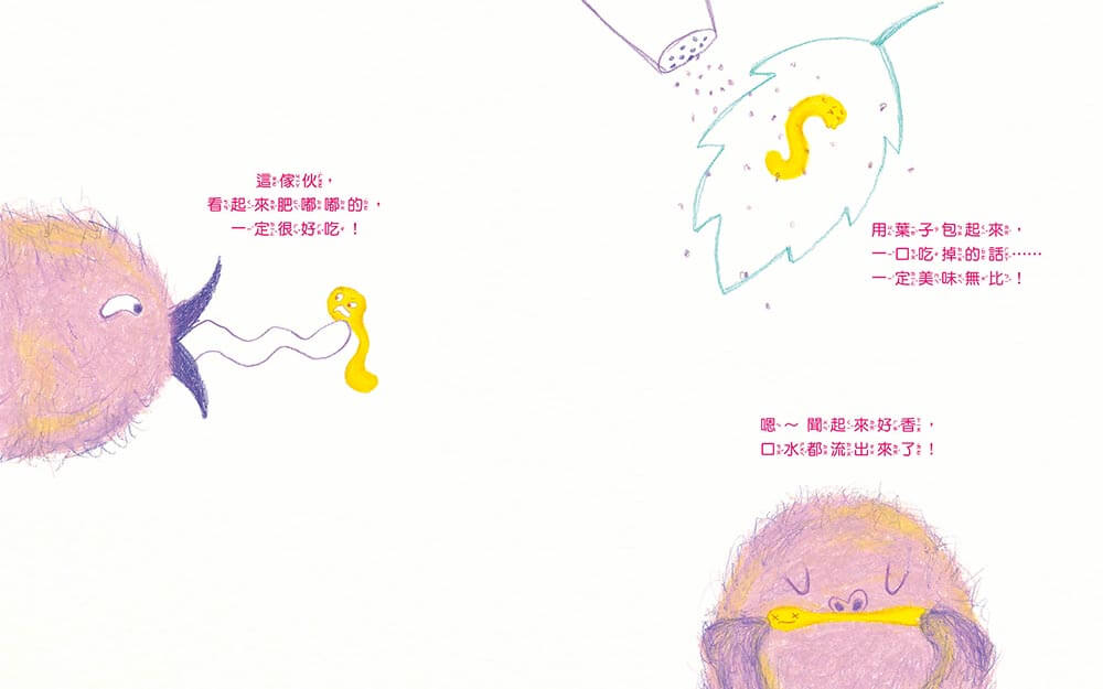 粉紅色小鳥為朋友帶來了肥胖的蠕蟲,想像著「你一定會喜歡」;藍色小鳥卻害怕得躲起來,於是畫下一條線:「請別靠太近」。