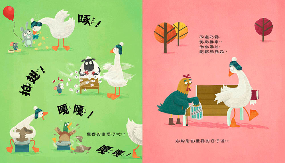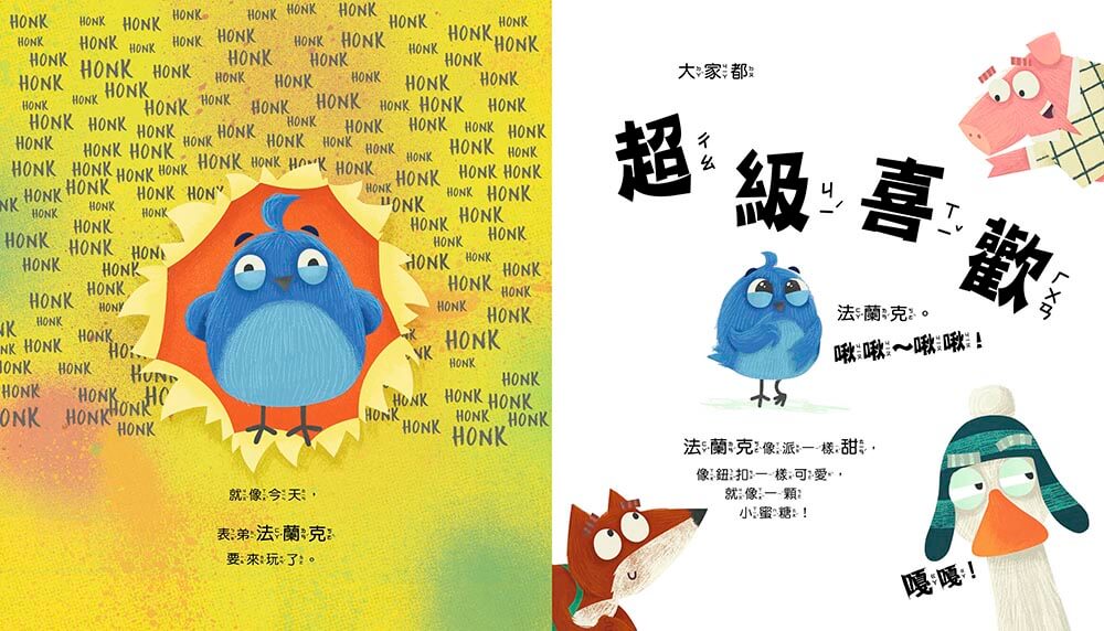 當搗蛋大王漢克遇上看似天真乖巧的表弟法蘭克,會發生什麼事呢?一場「誰比較乖」的大戰即將展開!翻開繪本,你會看到漢克一次次被冤枉,法蘭克總是若無其事,一鵝一鳥鬥智鬥趣,笑料連連。在熱鬧的混亂中,孩子將體會到——贏或輸不是最重要的,其實擁有溫暖的友情(還有一起玩)才最快樂!