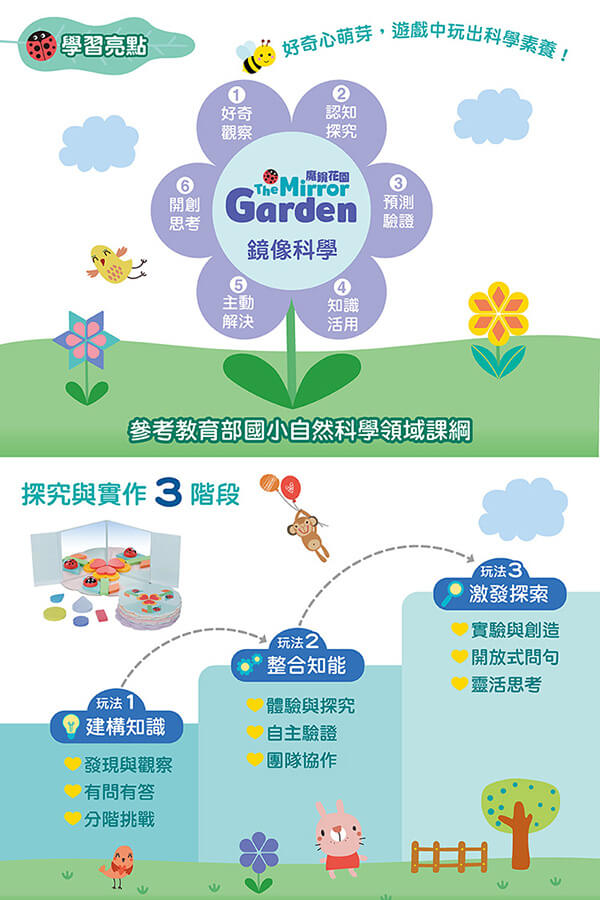 發現與體驗不同角度的鏡像反射,觀察形狀、數量、位置、平面對稱與立體圖形等變化。