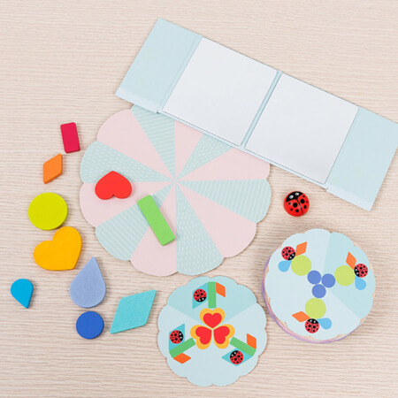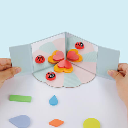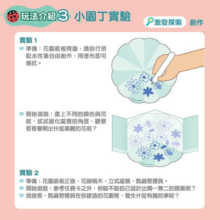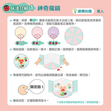 抽卡後,按照提示選擇魔鏡擺放角度與花瓣積木,排列出圖案與瓢蟲位置,完成後喊:開花啦!正確即獲得該卡。