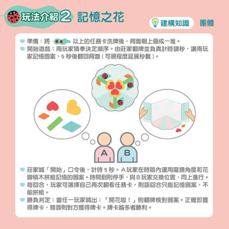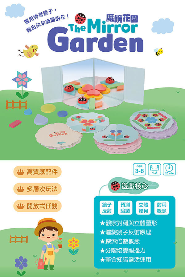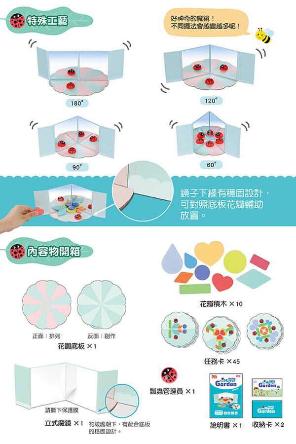 ●遊戲配件:瓢蟲管理員x1、立式魔鏡x1、任務卡x45、花瓣積木x10、花園底板x1